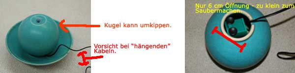 Normale Zimmerbrunnen aus Keramik, wie es sie z.B. beim Baumarkt, bei Töpfereien oder bei "Kaffeeanbieterketten" von Zeit zu Zeit gibt, tun es auch - hier ist aber wichtig darauf zu achten, das eine hochwertige Pumpe verbaut wurde - leider ist das meistens nicht der Fall und die Pumpe geht schon nach ein paar Tagen kaputt (siehe weiter unten) und das der Brunnen gut zu reinigen ist. Sogenannte "Schalenbrunnen" oder "Kugelbrunnen", bei denen eine Kugel, aus der das Wasser sprudelt, in einer Schale steht, haben den Nachteil, das wasserliebende Kätzchen (besonders seien hier Maine Coon genannt) hier komplett in das Wasser eintauchen können, bzw. den Brunnen nicht nur zum Trinken nehmen, sondern als Swimmingpool verwenden - das führt regelmäßig zu Überschwemmungen auch können sie sich unter Umständen in dem von der Schale hängenden Kabel verheddern, dann kippt die im Brunnen stehende Kugel sehr schnell einmal um oder zur Seite und die Pumpe pumpt das Wasser nicht in den Brunnen, sondern auf das Parkett. Diese Brunnen sollte man immer im Auge behalten. Auch ist die Kugel Innen in der Regel nur sehr schwer zu Reinigen, da selbst bei grossen Kugeln die Bodenöffnung nur wenige Zentimeter klein ist und man schlecht mit der Hand hineinkommt und sich im inneren der Kugeln meist schnell der sogenannte "Bakterienschleim" bildet. Von den beschriebenen Nachteilen abgesehen, sind diese Brunnen aber besser als Plastikbrunnen. Unseren alten Kugelbrunnen habe ich hier zur Verdeutlichung einmal fotografiert: